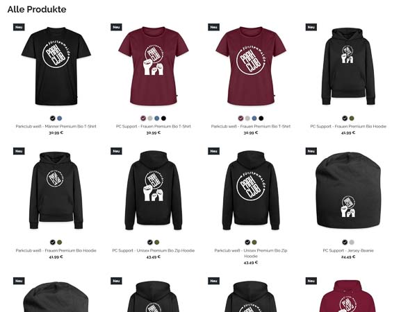Außerdem gibt es unseren Merch-Shop. Ob Shirts, Hoodies oder andere Artikel: Die Gewinne daraus fließen ebenfalls in die gleiche Kasse und helfen, den Parkclub langfristig zu sichern.